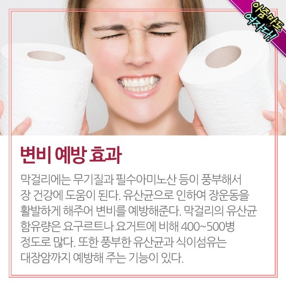 막걸리에 함유된 유산균은 장내 유익균을 증식시키고 유해균을 억제하여 장 건강을 개선합니다. 이는 소화를 돕고 변비를 예방하는 데 효과적입니다.